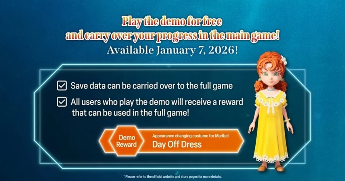 A Square Enix confirmou que Dragon Quest 7 Reimagined vai ganhar uma demo grátis no dia 7 de janeiro de 2026 no Steam, Nintendo Switch 2, Nintendo Switch, PlayStation 5 e Xbox Series X|S. Assim como outras demos lançadas perto da estreia, essa também permite transferir o progresso salvo para o jogo completo. Além disso, quem jogar a demo ainda ganha a recompensa Maribel’s Day Off Dress.
