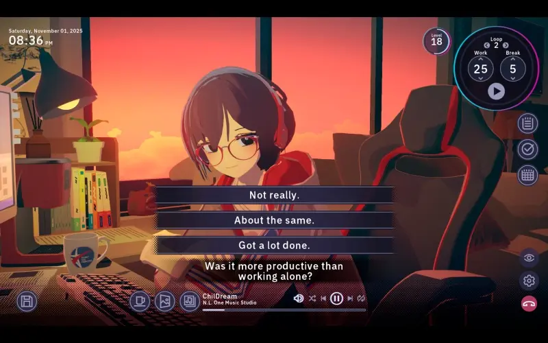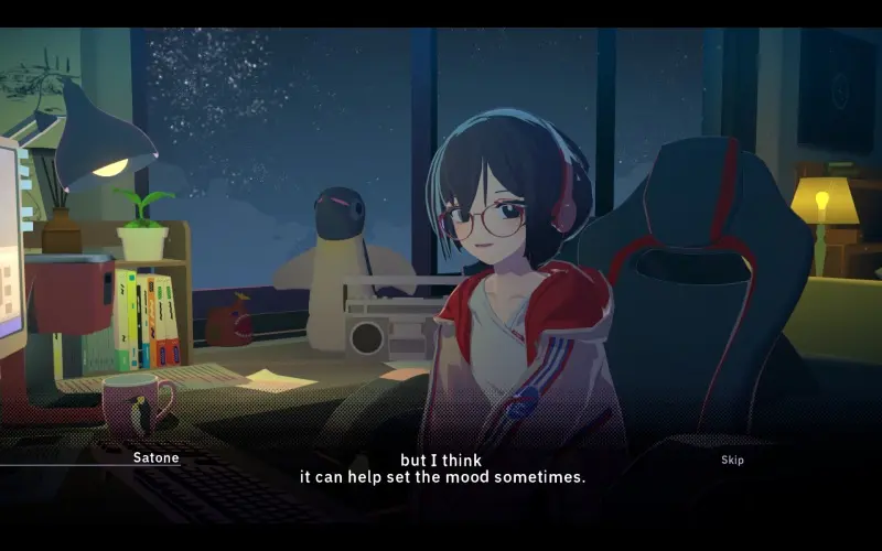 Trabalhe tranquilamente na sua secretária ao lado de Satone, uma rapariga criativa que escreve histórias e preenche o seu mundo com imaginação. Personalize o ambiente com música e imagens que refletem os sentimentos dela para ajudar na concentração mútua. À medida que passam mais tempo juntos, a sua ligação com Satone pode tornar-se mais profunda.