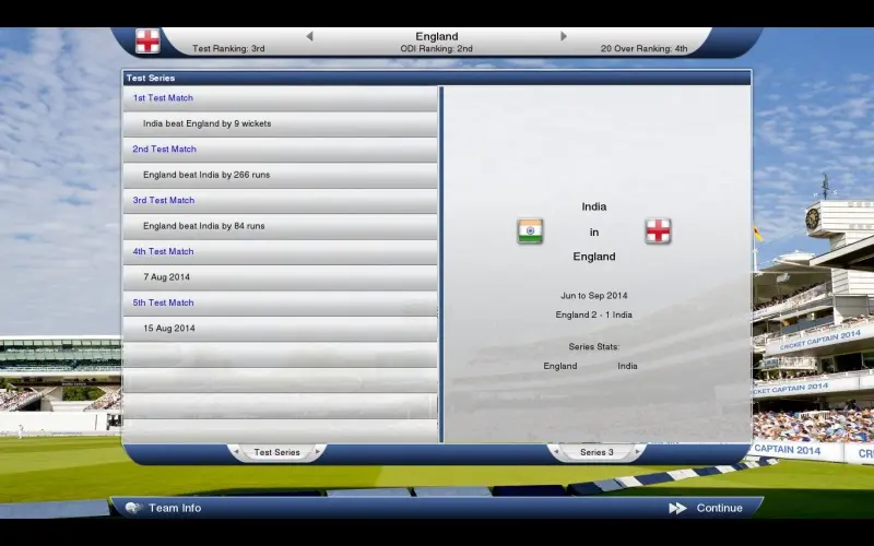 Cricket Captain 2014 coloca você no comando de equipes em competições nacionais e internacionais. Com nova interface, destaques 3D aprimorados e um grande banco de dados de jogadores, oferece uma profunda experiência de gestão de cricket. Controle elencos, jogue séries históricas e tome decisões estratégicas para alcançar vitórias.