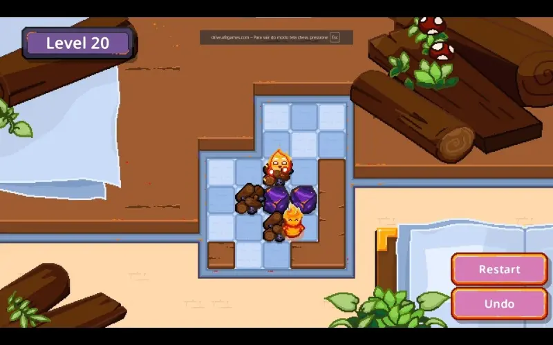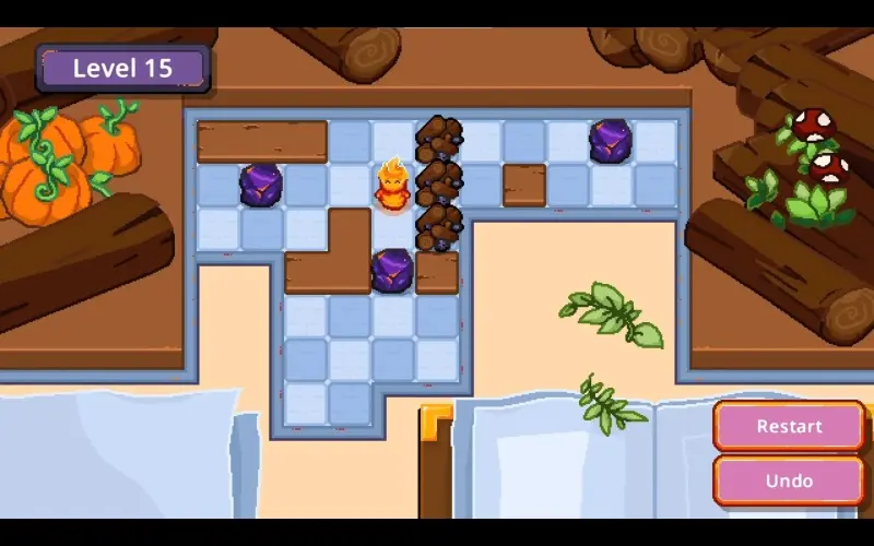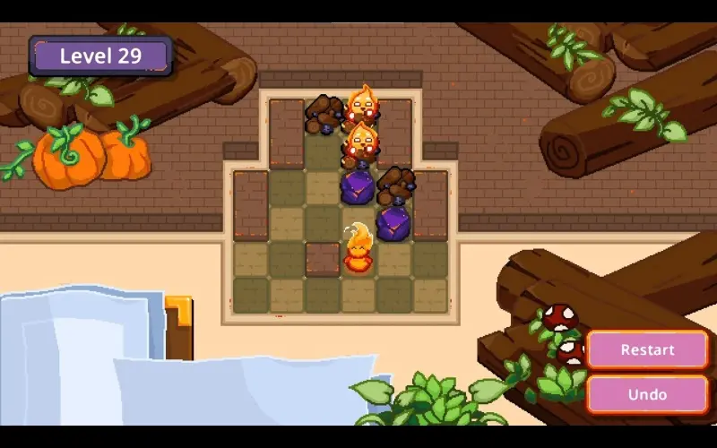 Um pequeno espírito de fogo percorre o tabuleiro, tile por tile, dentro de uma acolhedora lareira em pixel-art. Sua missão é empurrar pedaços de carvão para reacender as fogueiras adormecidas. Acenda todas as chamas e traga calor e charme a cada canto da lareira.