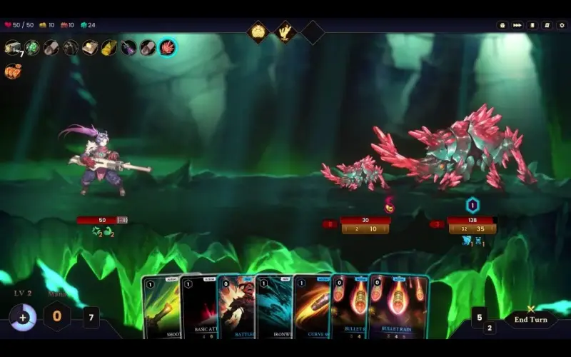 • Em vez de causar danos diretos uns aos outros, o combate é feito em duelos de cabo de guerra, onde atacar se torna a melhor forma de defesa, mas com uma quantidade limitada de recursos, a mana não se regenera automaticamente. Inspirado no sistema Land de Magic: The Gathering, as combinações que podes fazer são determinadas pela quantidade de mana que consegues gerir.