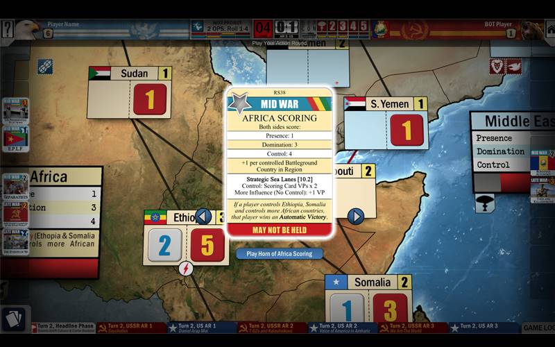 Jogue “Twilight Struggle Red Sea” e experimente a tensão da Guerra Fria centrada no Chifre da África. Escolha representar os EUA ou a União Soviética, buscando a dominação enquanto evita conflitos nucleares.