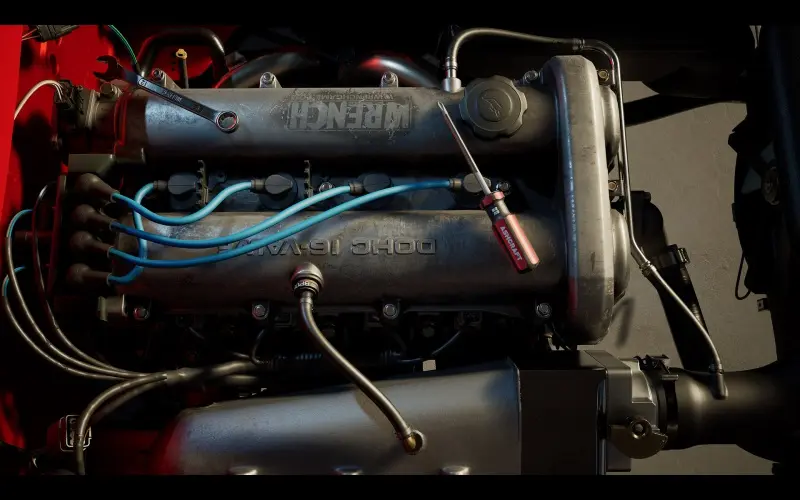 Cada motor é cuidadosamente detalhado, exigindo atenção precisa a parafusos, fixadores e especificações de torque. A mão desliza meticulosamente pelos motores brilhantes enquanto o técnico ajusta cada aspecto dos veículos de corrida de alto nível. O trabalho requer concentração, precisão e uma mão firme para cada reparo.