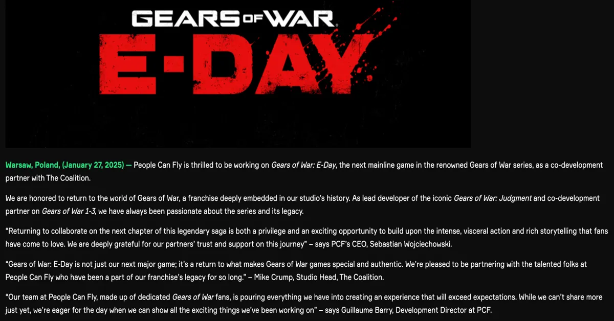 Uma novidade empolgante pra galera gamer! A People Can Fly, famosa por jogos como Outriders e Bulletstorm, anunciou uma parceria com a The Coalition pra co-desenvolver o próximo Gears of War: E-Day. Essa colaboração marca o retorno da People Can Fly à franquia, já que eles lideraram o desenvolvimento de Gears of War Judgment e contribuíram pra outros títulos da série.