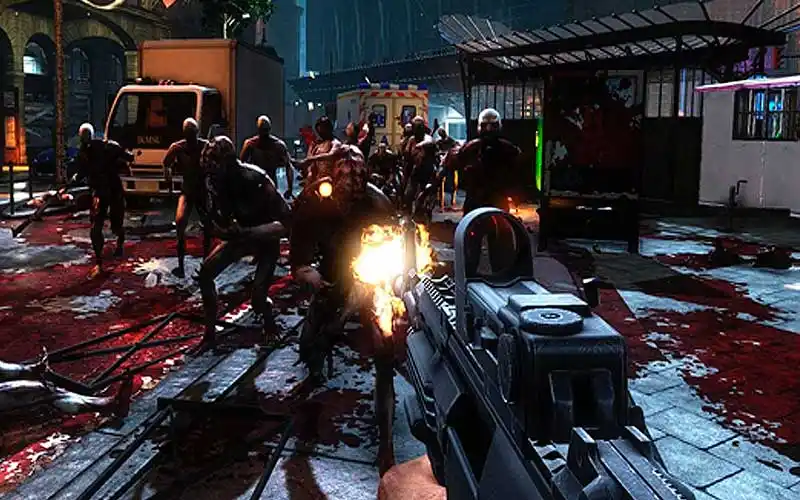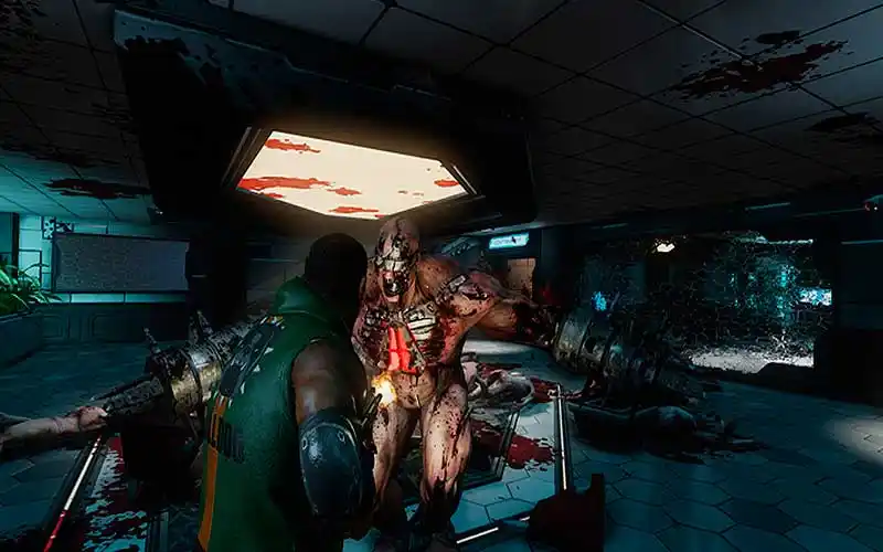 Killing Floor 2 Alienware Mask apresenta ação e sangue brutais e exagerados.