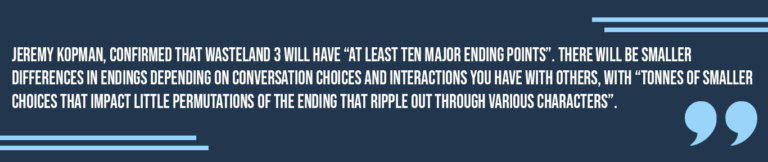 Numa entrevista recente com a PCGamesN, o designer de nível principal do jogo, Jeremy Kopman, confirmou que o Wasteland 3 terá “pelo menos dez pontos finais importantes“. Haverá diferenças menores nos finais, dependendo das escolhas de conversação e das interacções que tiver com os outros, com “toneladas de escolhas menores que têm pouco impacto nas pequenas permutações do final que se vão estampando através de várias personagens“.